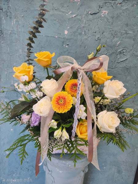 A graceful arrangement of yellow roses and soft white blooms, expressing warmth, gratitude, and gentle blessings. An elegant floral basket perfect for celebrating meaningful moments or sharing heartfelt wishes.
