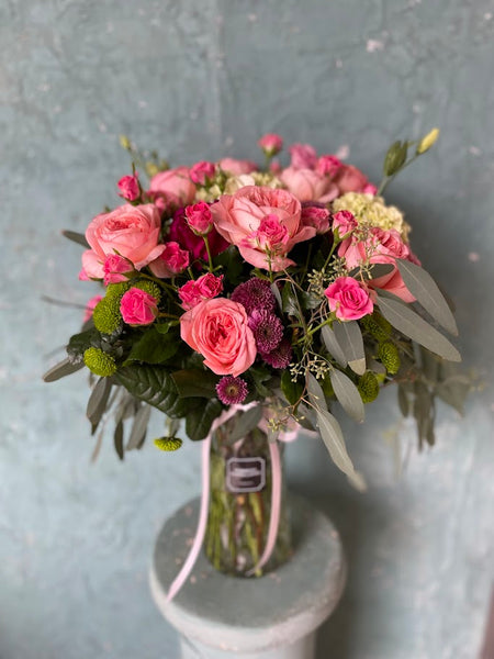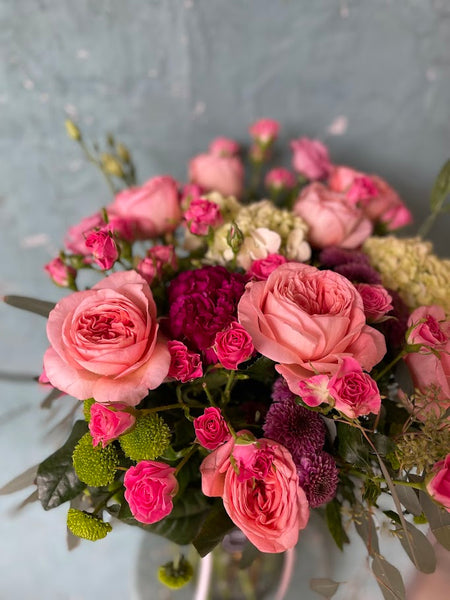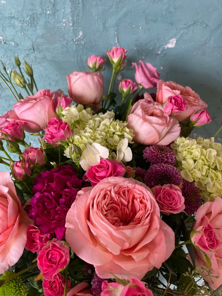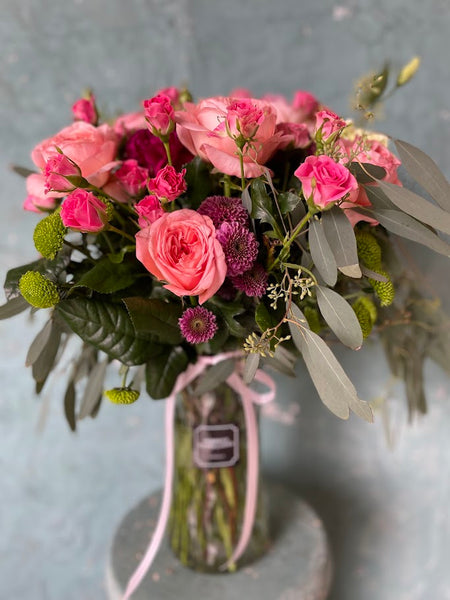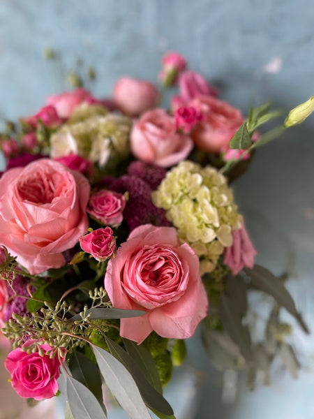 Lush pink and mini spray roses with seasonal greenery, eucalyptus, and touches of purple and green. Handcrafted, elegant, and perfect for any occasion.