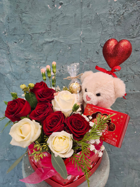 "This cuddly bear is here to deliver sweet roses and even sweeter chocolates!"