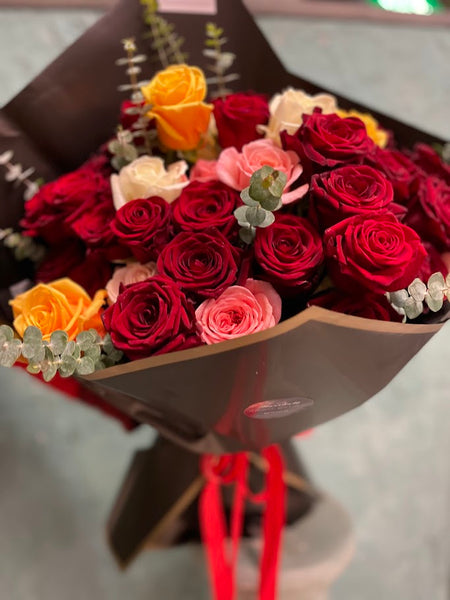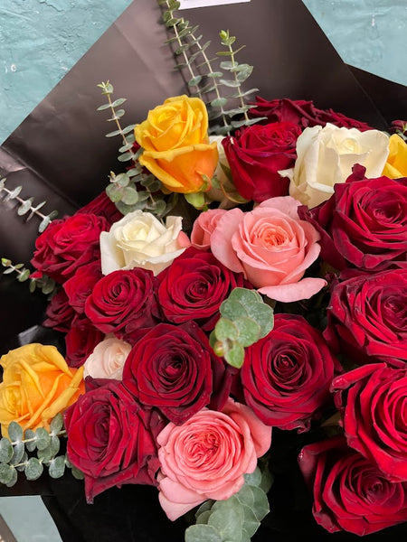 A luxurious bouquet featuring 48 (4-dozen) fresh roses in rich red, soft pink, and vibrant yellow tones. This arrangement creates a classic and upscale presentation suitable for celebrations, anniversaries, and special gifts.