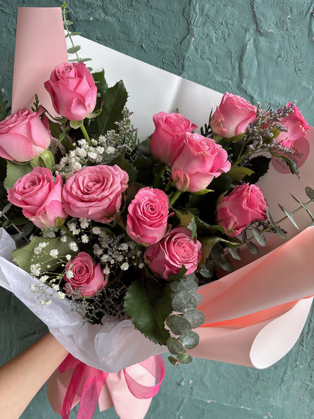 This bouquet features radiant hot pink roses paired with delicate baby’s breath and fresh greenery, creating a striking balance of romance and energy.