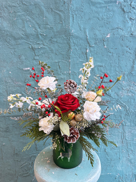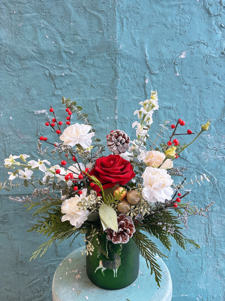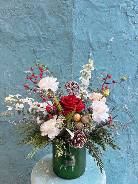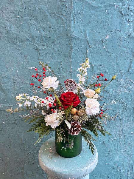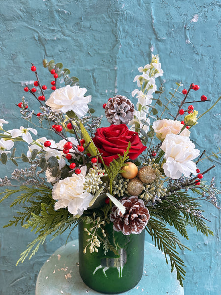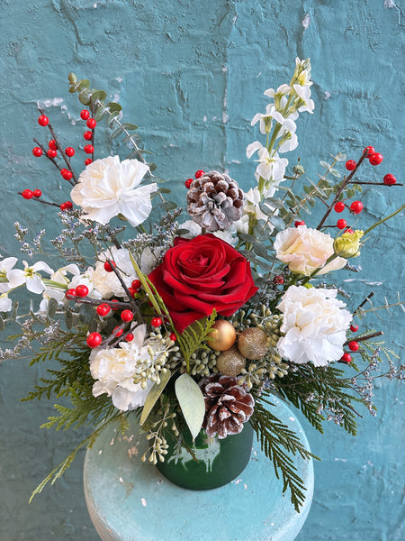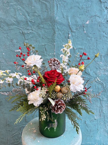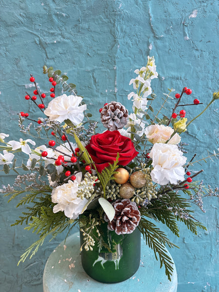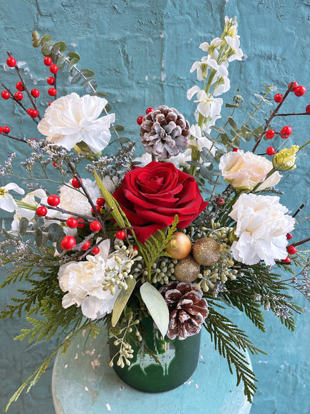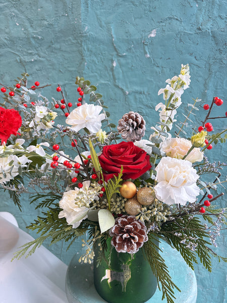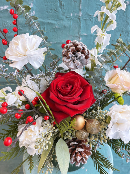 A festive blend of Christmas magic! this arrangement features lush red roses, bright carnations, snowy white blooms, and winter evergreens accented with sparkling berries. It brings the perfect balance of warmth, color, and holiday cheer. A charming piece to brighten any home throughout the Christmas season.