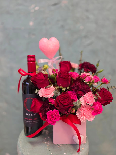 A sweet Valentineās Day gift featuring red and pink roses, seasonal blooms, and a bottle of wine, all beautifully arranged. Perfect for an all-in-one romantic surprise.