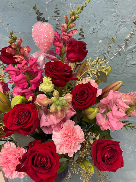 A romantic arrangement featuring lush red roses, soft pink carnations, lilies, and seasonal greenery, beautifully designed in a keepsake vase. Perfect for saying I love you most timelessly.