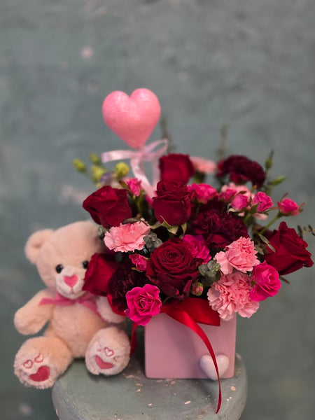 A romantic Valentineās Day flower box with red roses and pink flowers, soft carnations, seasonal blooms, a heart accent, and a cuddly teddy bear. Sweet, playful, and perfect for gifting.