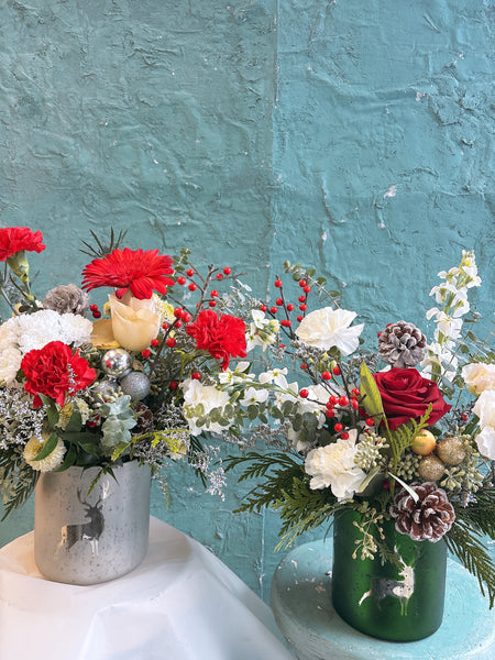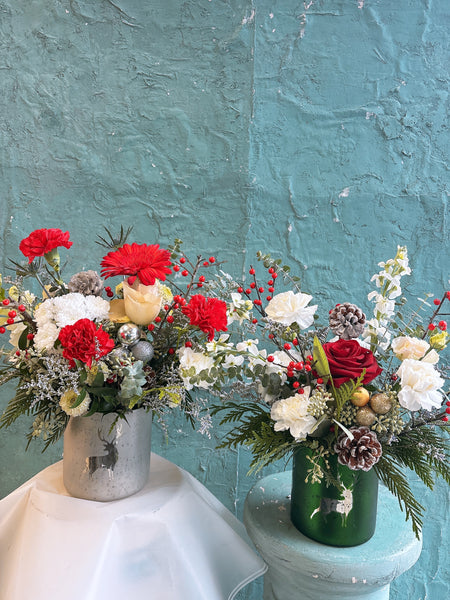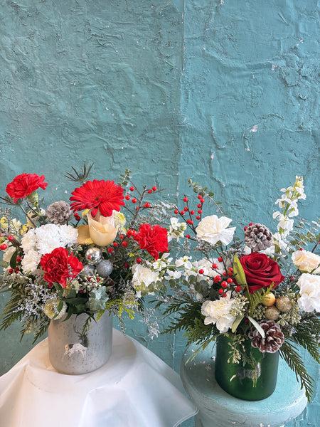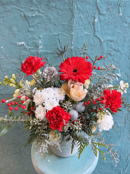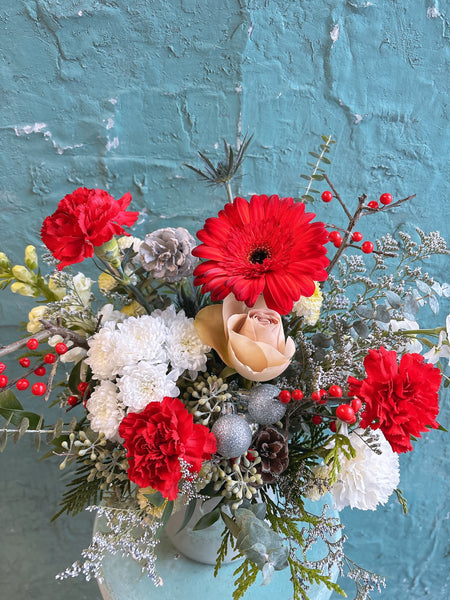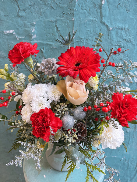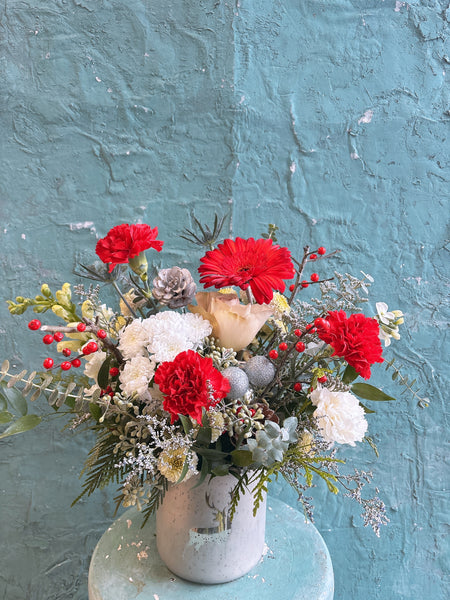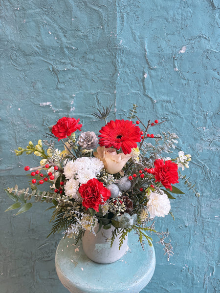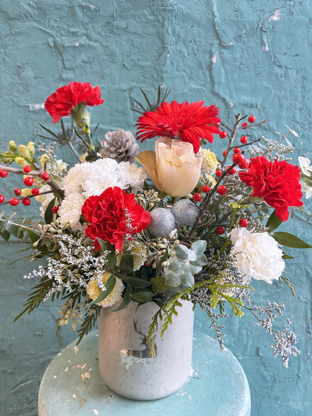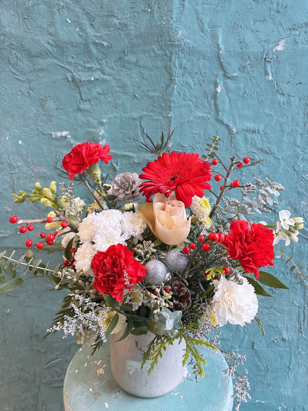 A festive blend of Christmas magic! this arrangement features lush red roses, bright carnations, snowy white blooms, and winter evergreens accented with sparkling berries. It brings the perfect balance of warmth, color, and holiday cheer. A charming piece to brighten any home throughout the Christmas season.