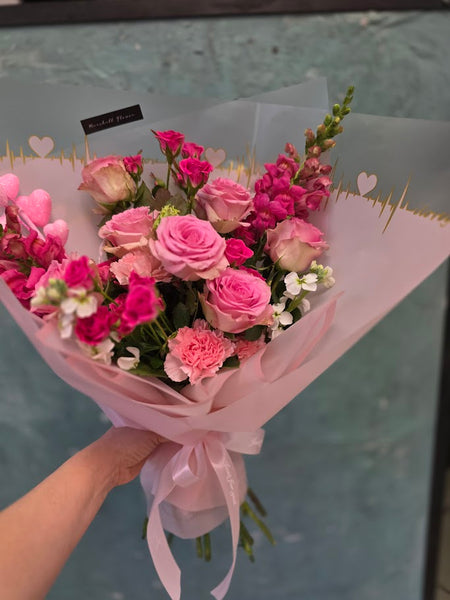 Romantic mix of blush and hot-pink roses with delicate accent blooms, hand-wrapped in soft pastel paper—perfect for gifting.