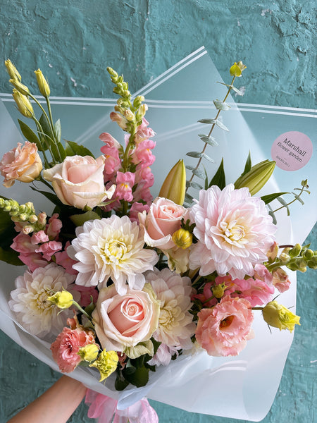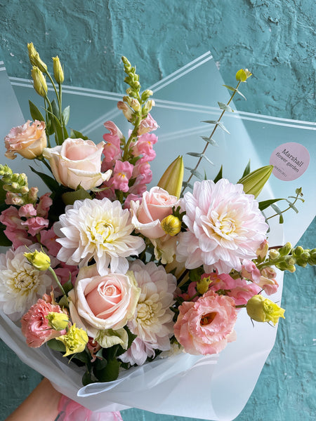 This soft blush dahlia bought is perfectly balanced with pastel tones and delicate textures, it’s a timeless arrangement for celebrating love, joy, and sweet moments.