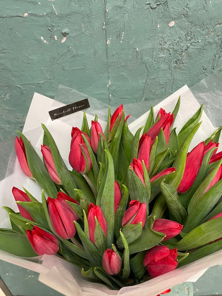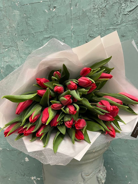 Fresh red tulips wrapped in premium paper with a romantic ribbon—simple, elegant, and perfect for any special gift.