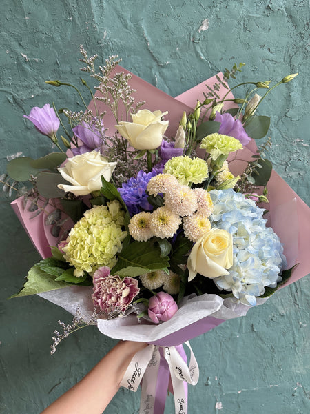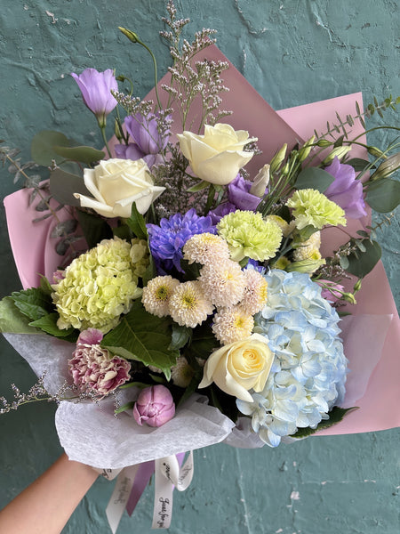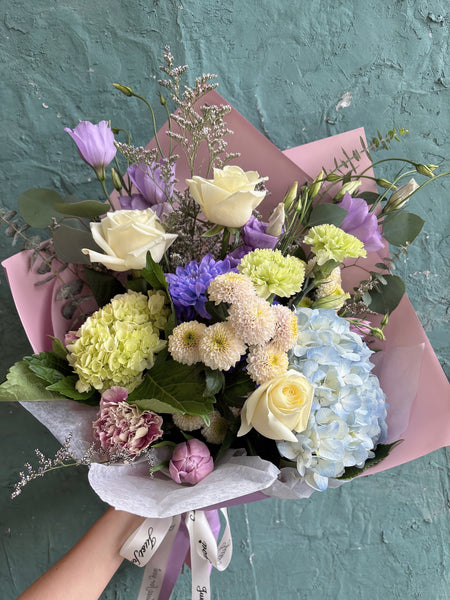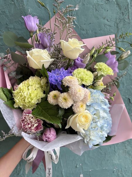 A soft and elegant bouquet that blends cool tones of lavender, cream, and pale blue. It features creamy white roses, gentle purple lisianthus, pastel hydrangeas, and delicate chrysanthemums. The combination creates a refreshing and romantic look perfect for expressing calm affection, appreciation, or a peaceful celebration.