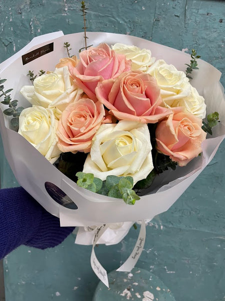 Elegant mix of peach and ivory roses with fresh greenery, hand-wrapped in premium paper—soft, romantic, and perfect for any special gift.