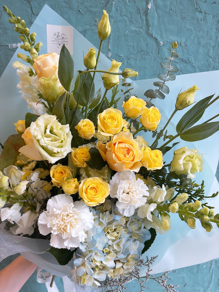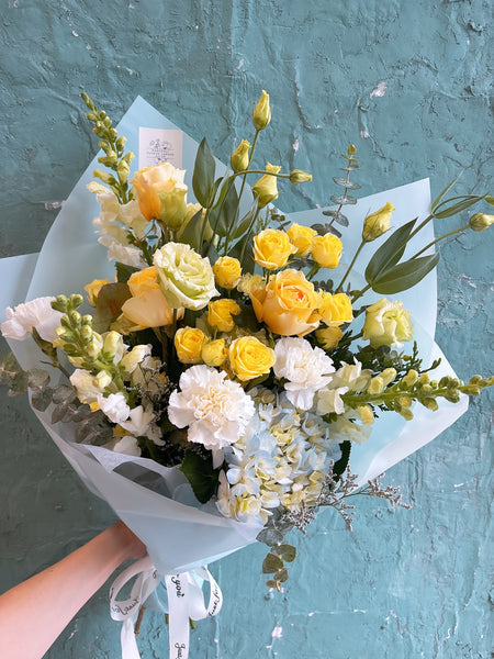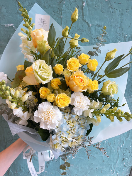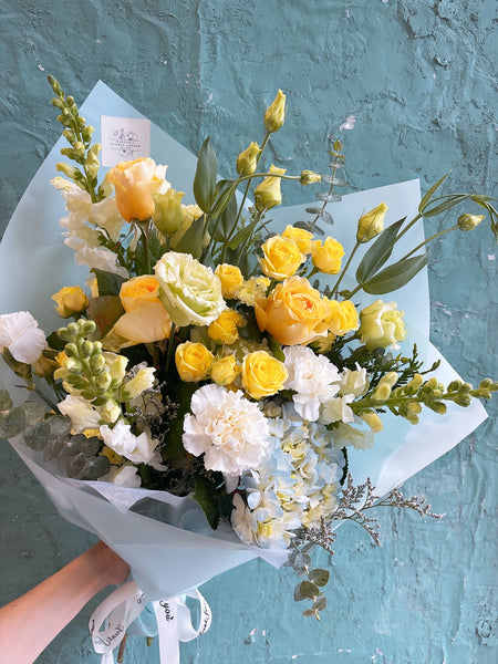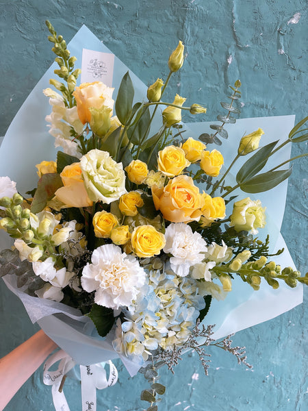 A fresh and elegant bouquet that captures the gentle beauty of spring. Soft yellow roses and delicate spray roses bring a warm, sunny glow, while white carnations and lisianthus add a touch of softness and charm. Light blue hydrangea creates a refreshing contrast, and accents of snapdragons and eucalyptus give the arrangement natural texture and movement.