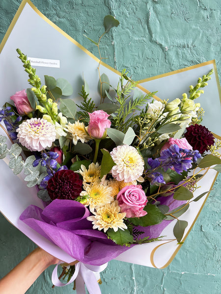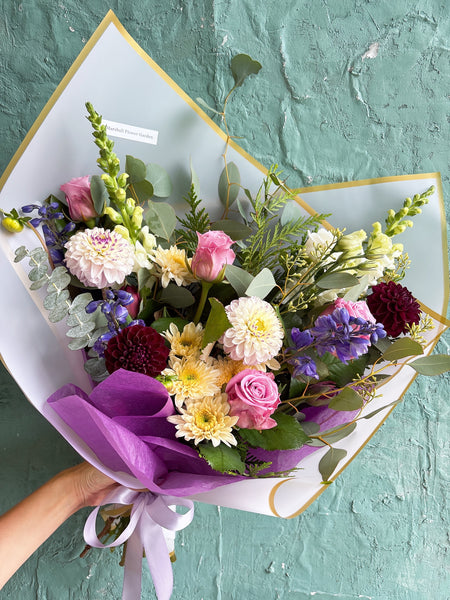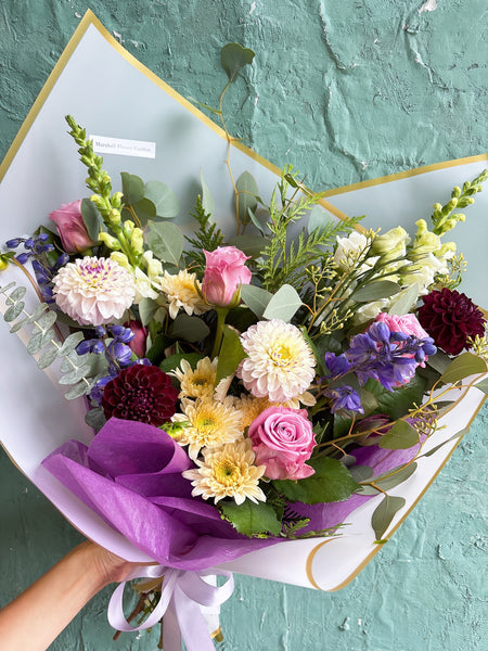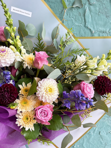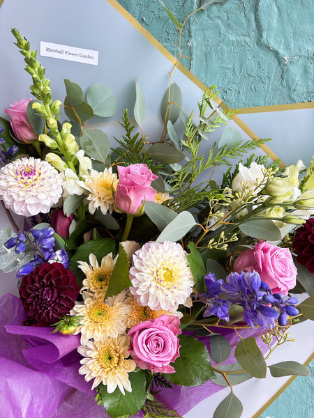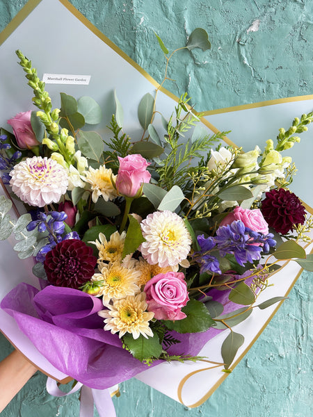 This bouquet is full of life and rich color harmony, a blend of deep burgundy dahlias, soft pink roses, creamy chrysanthemums, and touches of blue delphinium. Here are some poetic name and caption ideas that suit its elegant yet spirited vibe.