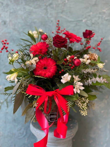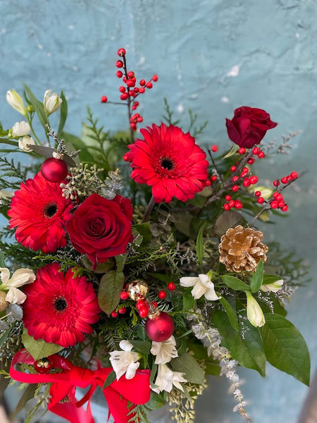 A vibrant holiday arrangement featuring red gerberas, red roses, seasonal berries, white accent flowers, festive ornaments, and lush greenery. Designed with a bold holiday ribbon, perfect as a cheerful gift or centerpiece for the season.