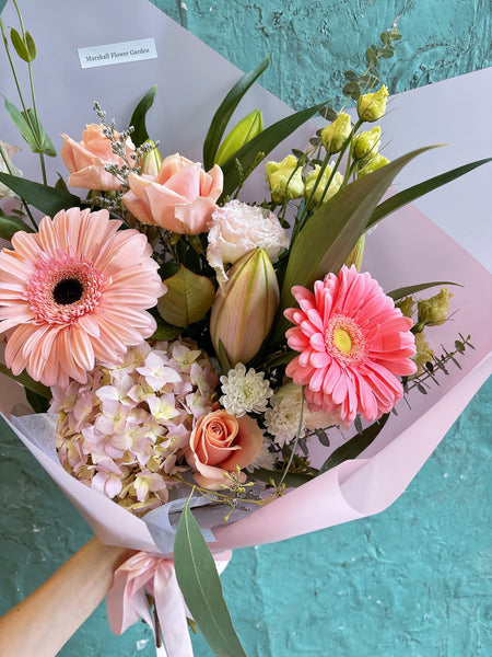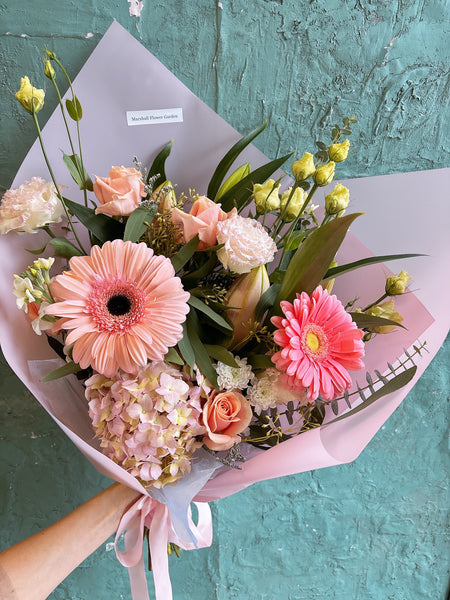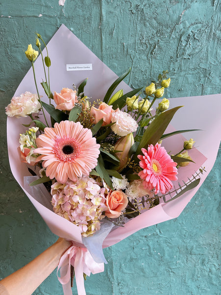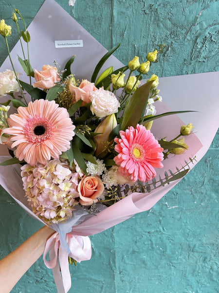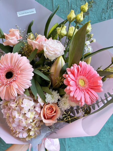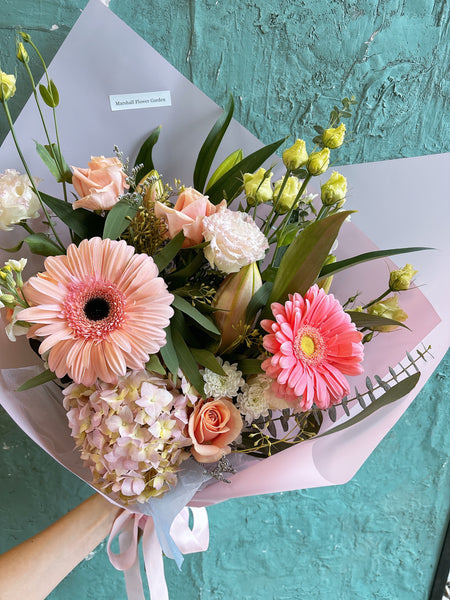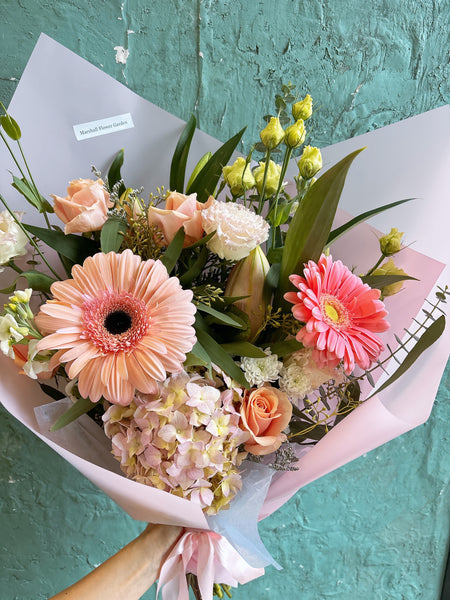 A soft and elegant bouquet featuring peach and blush gerbera daisies, creamy roses, delicate hydrangea, and pale green lisianthus buds. Accented with gentle white blooms and lush greenery, this arrangement has an airy, graceful feel. Wrapped in blush pink paper, it expresses warmth, calm, and refined beauty—perfect for birthdays, thank-you gifts, congratulations, or simply to share a gentle moment of joy.