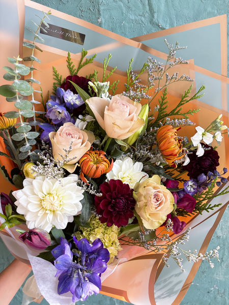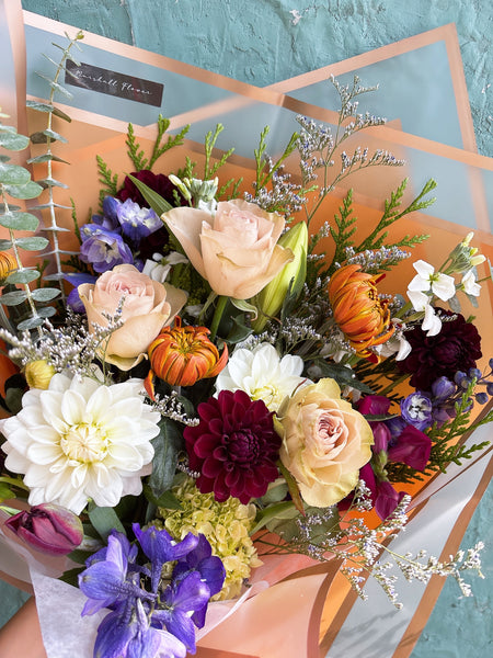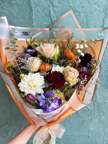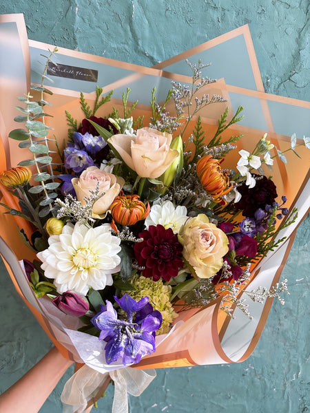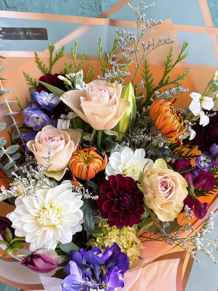 A warm symphony of fall tones, creamy blush roses, deep burgundy dahlias, ivory blooms, and accents of vibrant orange and violet. This bouquet captures the cozy elegance of autumn days and crisp golden sunsets. Perfect for celebrating the season’s beauty or gifting a touch of warmth.