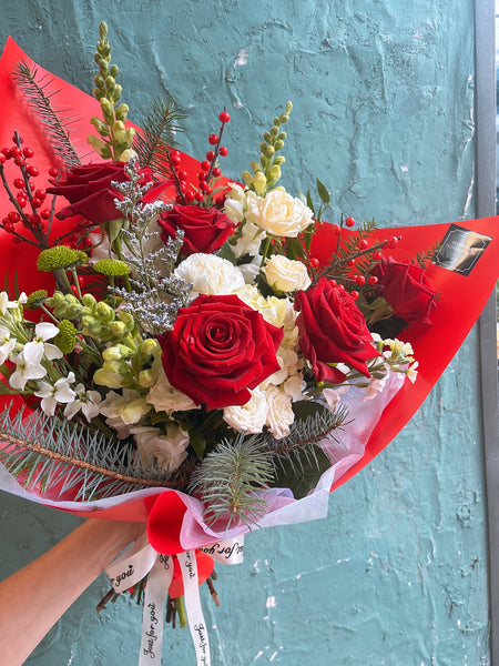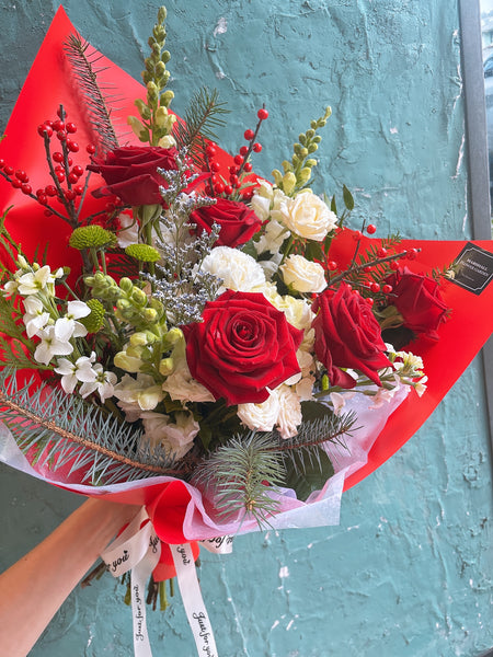 A festive Christmas bouquet overflowing with rich red roses, snowy white blooms, winter berries, and fresh evergreens. Wrapped in bold holiday red, this arrangement blends classic Christmas colors with elegant textures, creating a warm and romantic seasonal statement. Perfect for gifting, decorating, or adding a touch of holiday magic to any home.
