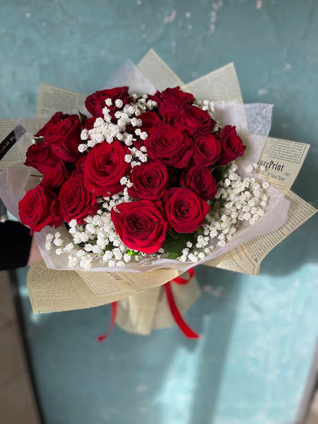 A timeless expression of love and elegance, this bouquet features premium long-stemmed red roses paired with delicate white baby’s breath. Wrapped in vintage-style paper, it’s perfect for anniversaries, romantic gestures, or any occasion that calls for classic beauty.