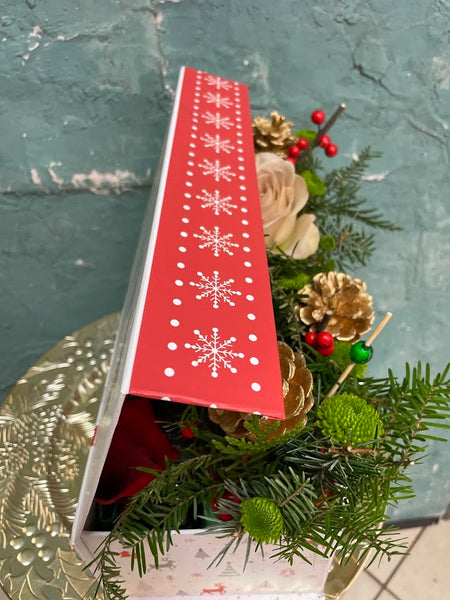 A festive gift box featuring a premium bottle of red wine surrounded by elegant winter greens, preserved rose, golden pinecones, berries, and Christmas accents. Perfect for holiday celebrations, client gifts, or a luxurious seasonal surprise.