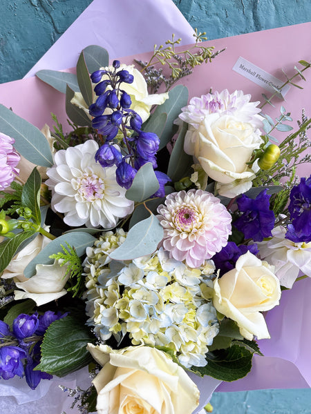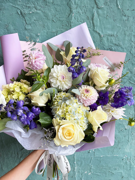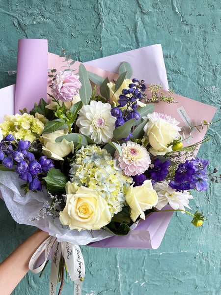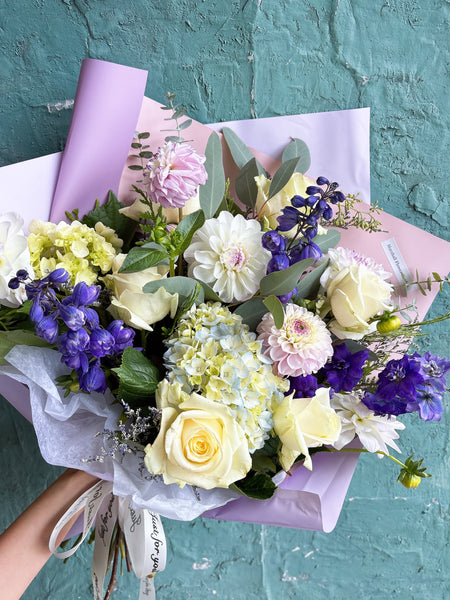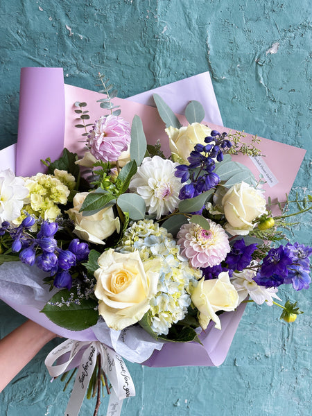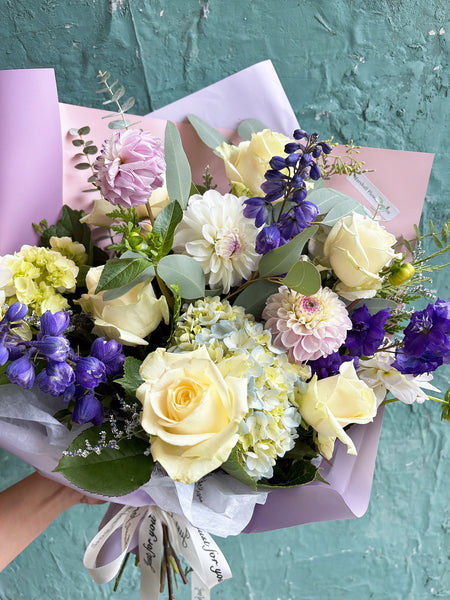 This Bouquet is a graceful arrangement combining creamy yellow roses, pale pink dahlias, delicate blue hydrangeas, and rich violet delphiniums. Accented with eucalyptus and soft greenery, it creates a fresh, romantic look perfect for expressing love, gratitude, or congratulations. Wrapped in pastel lavender and blush paper with a “Just for you” ribbon, it’s both charming and refined, ideal for any heartfelt occasion.
