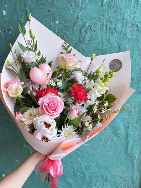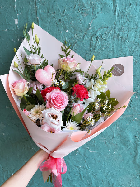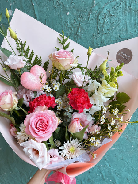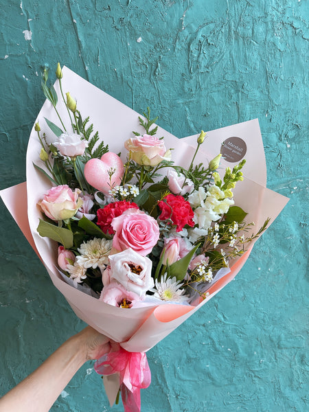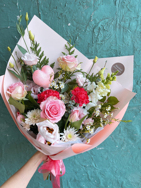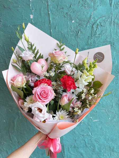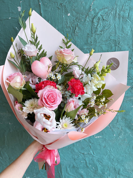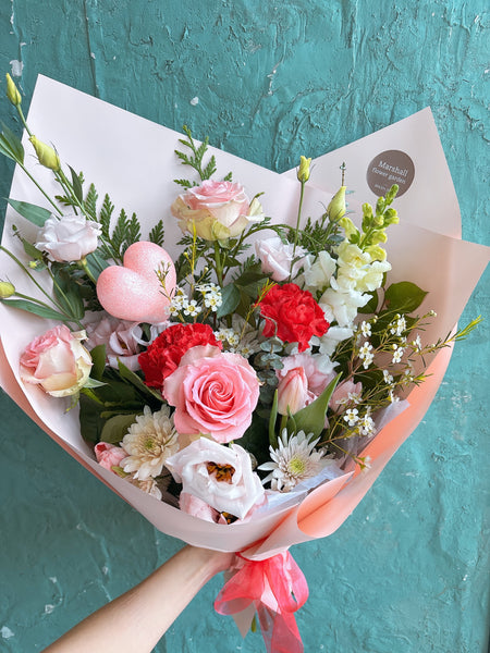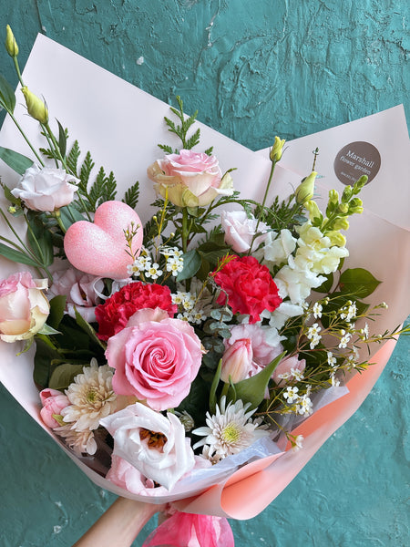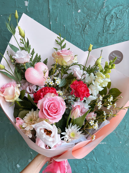 A charming mix of three roses paired with seasonal blooms and greenery.